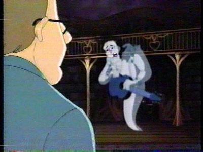 At the mansion, Dr. Harvey is currently in a therapy session with Elvis's ghost -- one of the few times I've seen a cartoon where Elvis is actually portrayed as DEAD. "Now, if'n ya don't mind, I'm'a gonna go haunt Lisa Marie. What is she thinking?" Bad timing here....he's referring to Michael Jackson's marriage to Elvis's daughter, which ended around the time this episode first aired.