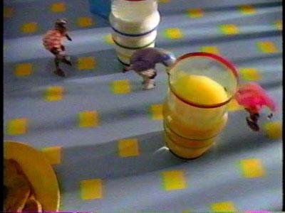 | Unusually, this ad for Kellogg's is selling....nothing. Unless you count the subliminal addition of the giant Rice Krispies box in the background, it's simply an ad about the virtue of eating a large breakfast. Of course, a large breakfast benefits Kellogg's financially, so why would they not care? To make the ad "hipper" they have added Micro Machine-sized preteens rollerblading around the table and playing basketball. | ![]() |
