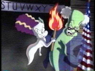 The class is taught by Miss Banshee, whose schtick is that she randomly screams really loud now and then. Banshee announces the annual Spooking Bee is coming up, and when she realizes the entire class is asleep, she turns into a rooster and screams "COCK-A-DOODLE-BOOOOOOOOOO!!!" Note the Elmyra-looking ghost near the front of the class -- had to be intentional.