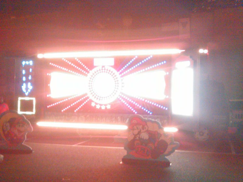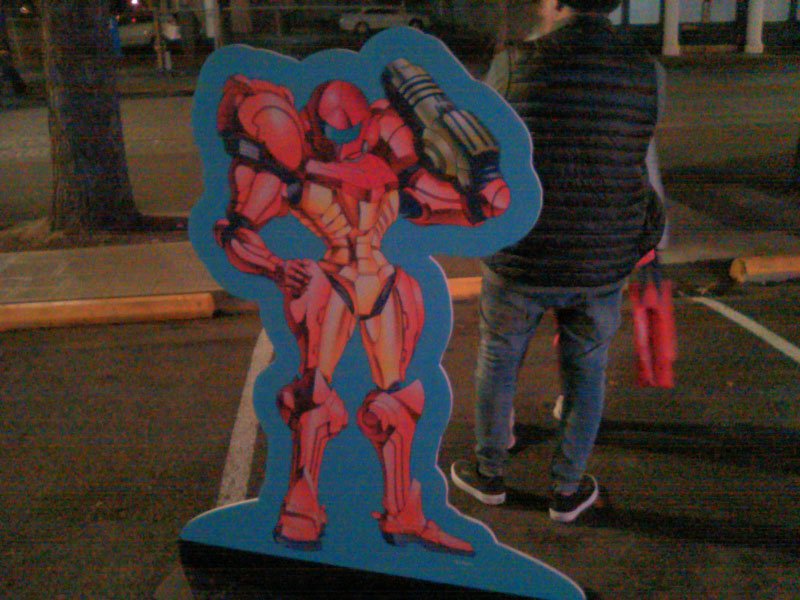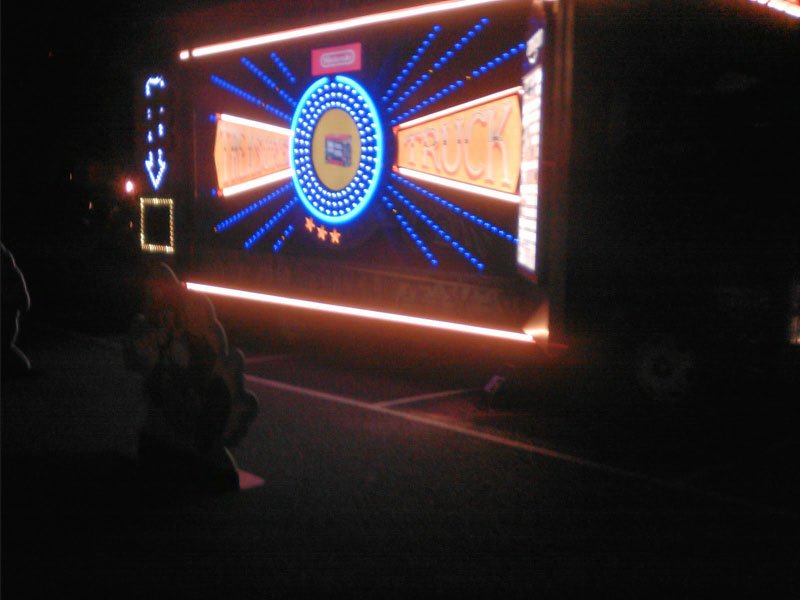 At least there was a lot to look at. The parking lot was dotted with standees of Nintendo characters and Super NES art -- Mario, Link, Yoshi and Samus were all accounted for, and Mario came in several variations like Cape Mario and Kart Mario. The bubble machine was still going even this late at night, and the SNES-era video game soundtrack coming from the speakers was nice to have in the background. I wished trucks like this existed every day.