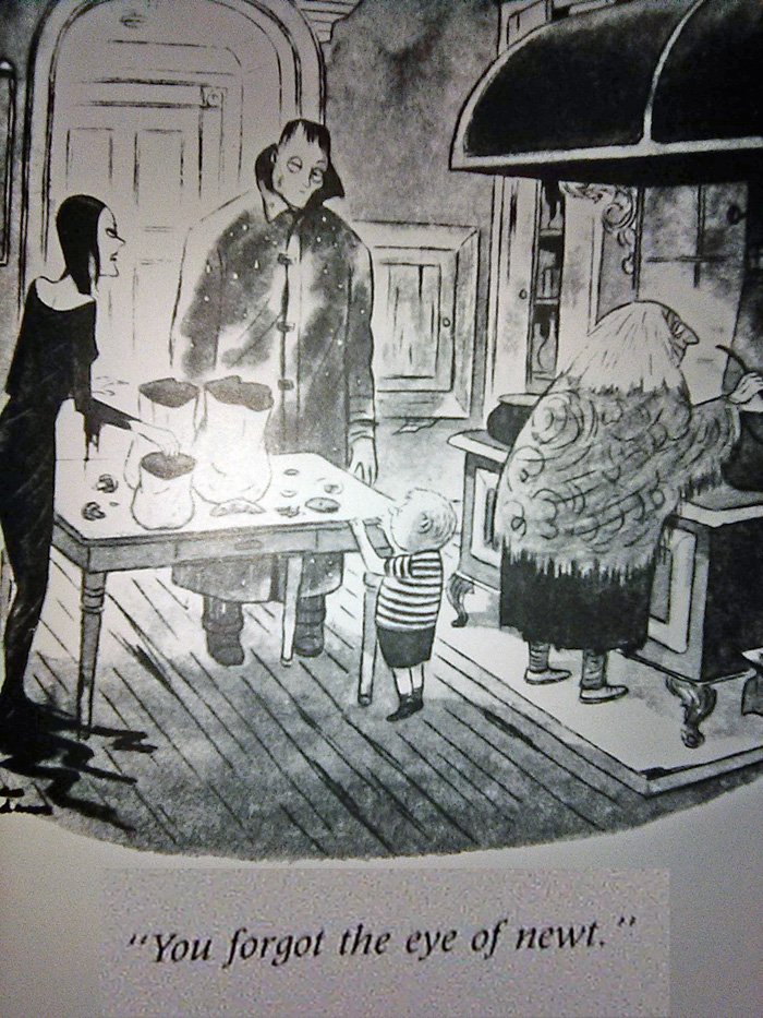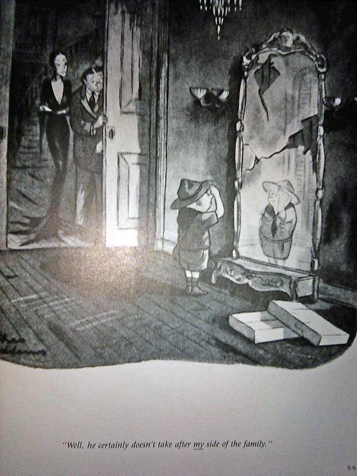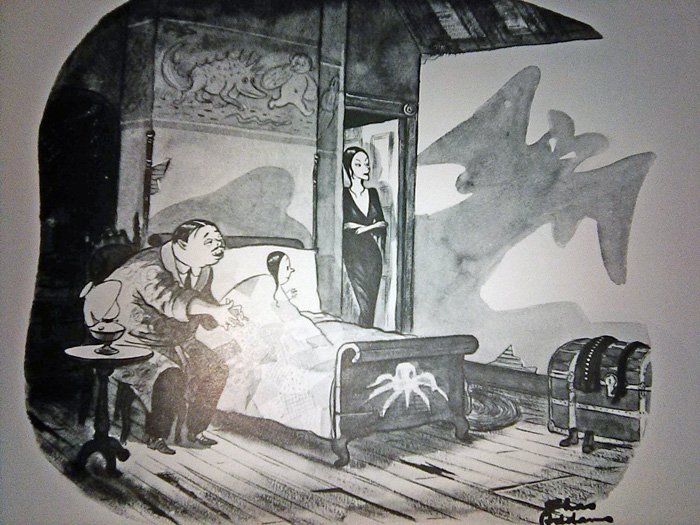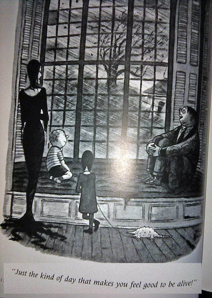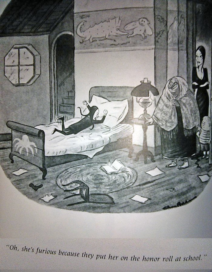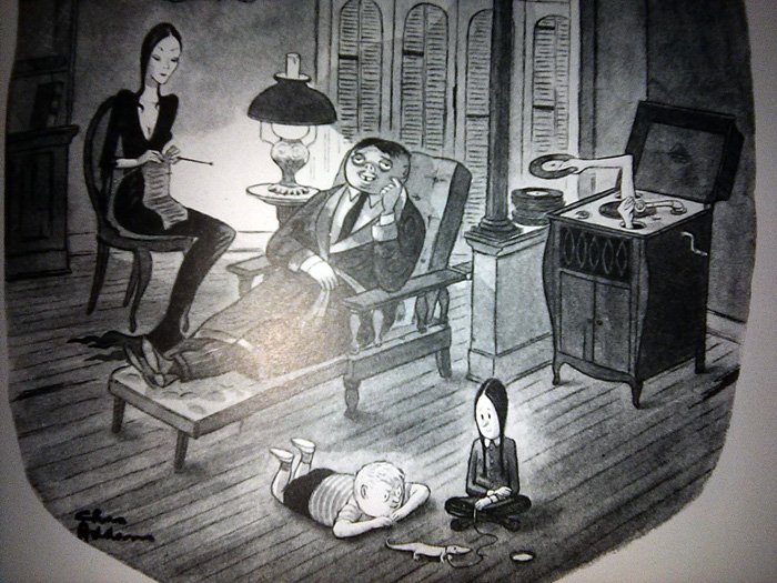 There is one problem we have to address first...The World of Charles Addams, released by Knopf Publishing in 1991 (just in time for the movie!) is a very large and heavy book whose pages I cannot fit onto my printer-scanner very easily. Thus I am forced to use my cell phone camera for these, which is why they won't look so good. I threw a million filters on 'em to make them clearer, but this also gave some of them a very washed-out appearance. And this is late as it is, being released Halloween night, so there's no time to go back and do this again. Sorry in advance.