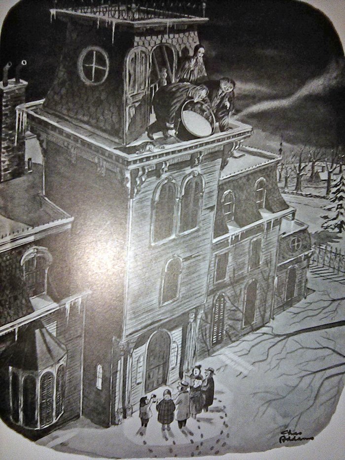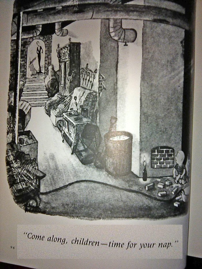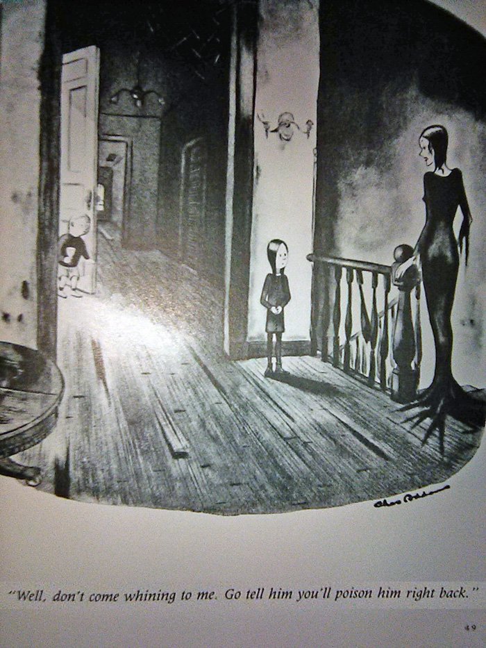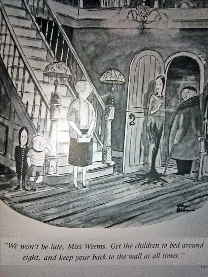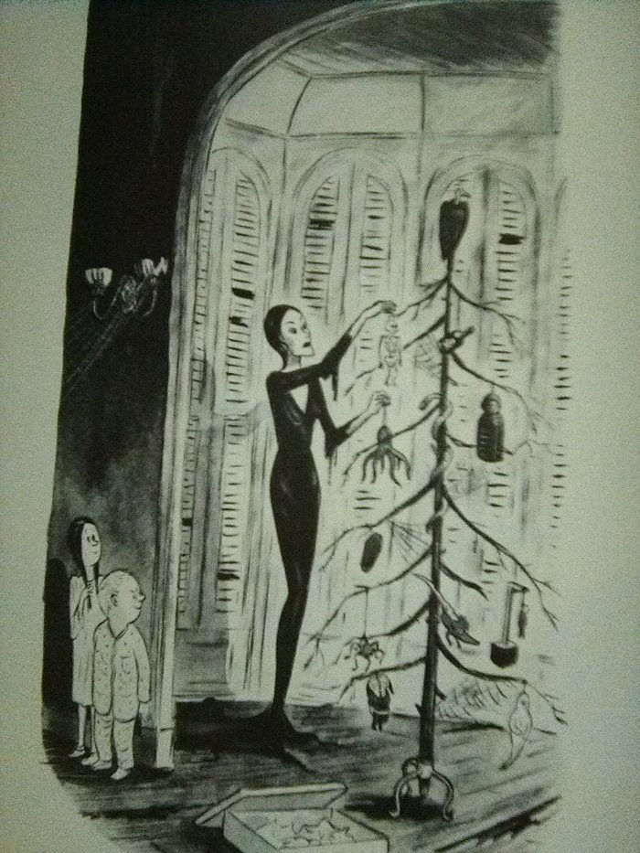 There is one problem we have to address first...The World of Charles Addams, released by Knopf Publishing in 1991 (just in time for the movie!) is a very large and heavy book whose pages I cannot fit onto my printer-scanner very easily. Thus I am forced to use my cell phone camera for these, which is why they won't look so good. I threw a million filters on 'em to make them clearer, but this also gave some of them a very washed-out appearance. And this is late as it is, being released Halloween night, so there's no time to go back and do this again. Sorry in advance.