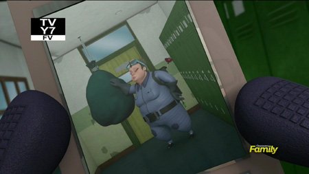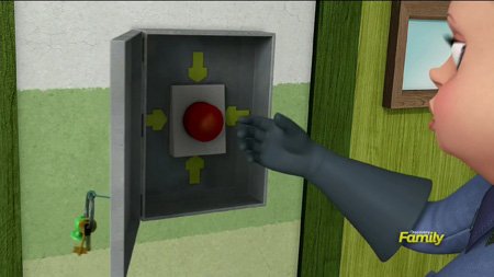 Nearby, the school security guard is standing around when she turns her head and notices the locker door wobbling open and shut by itself. Despite this being the more grounded of the two worlds, she IMMEDIATELY concludes that the school is haunted by a ghost. She unlocks a panel to reveal a big red button, and pounds it.