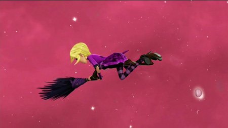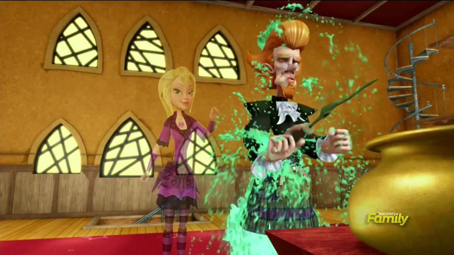 The other witches turn up on their brooms just as Sabrina and her troll gang are slamming the front gate with their clubs. It's now or never to try the cure. Lupa aims and fires, Sabrina is surrounded by a green glow, and then she faints.