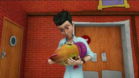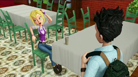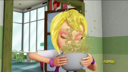 Returning to the story, Sabrina is now in the mortal realm, but she still thinks she's a troll. Sabrina is standing cluelessly on the street when one of her human friends approaches and yells that they're both late for school. Sabrina doesn't even know what a school is, so she's dragged there by the hand. At school, she walks like a caveman into the cafeteria. Several loud crashes and screaming patrons later, she emerges from the door devouring a bowl of glop without utensils. Then she runs into Jim....who she thinks is cute, and a troll expresses this feeling by slapping their potential mate with a large dead fish. Jim is....turned on by this. Amy never stood a chance with him.