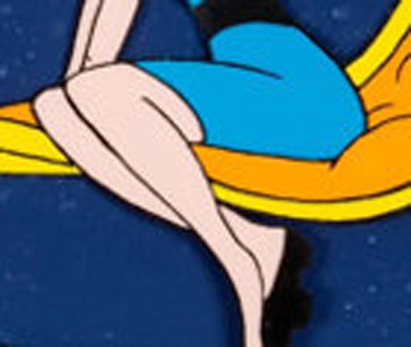 This is not an animation goof. I had to pick a shot from a promo because I don't have all day to sift through episodes, but trust me -- in the DEEK cartoon, that is how Sabrina sits on her broom EVERY TIME you see her on one. It is never between the legs, it is always on the side. It looks awkward and strange, and it shouldn't even work -- she's barely on the broom at all. If proper physics were applied she'd fall right off.