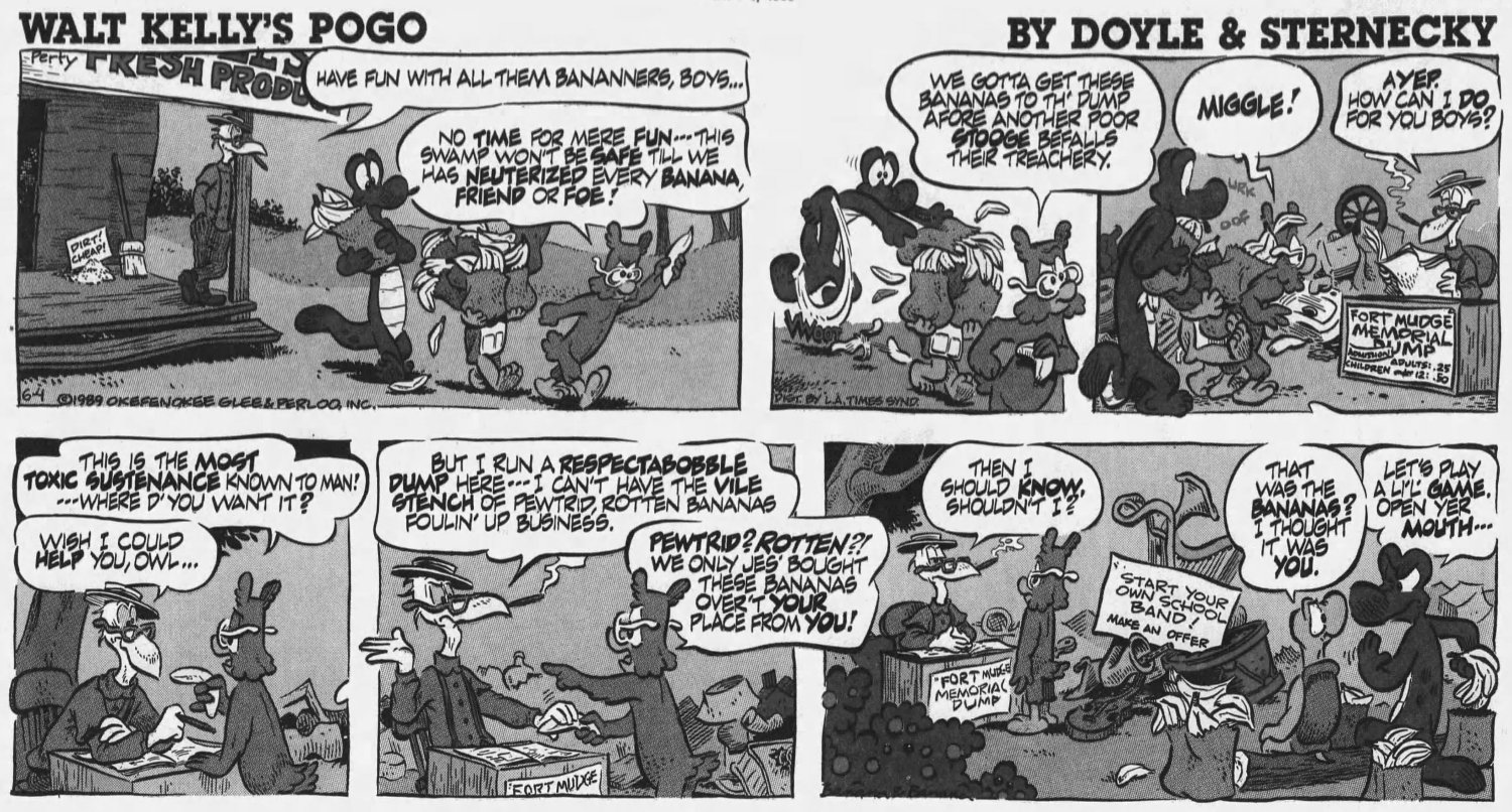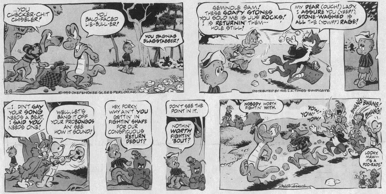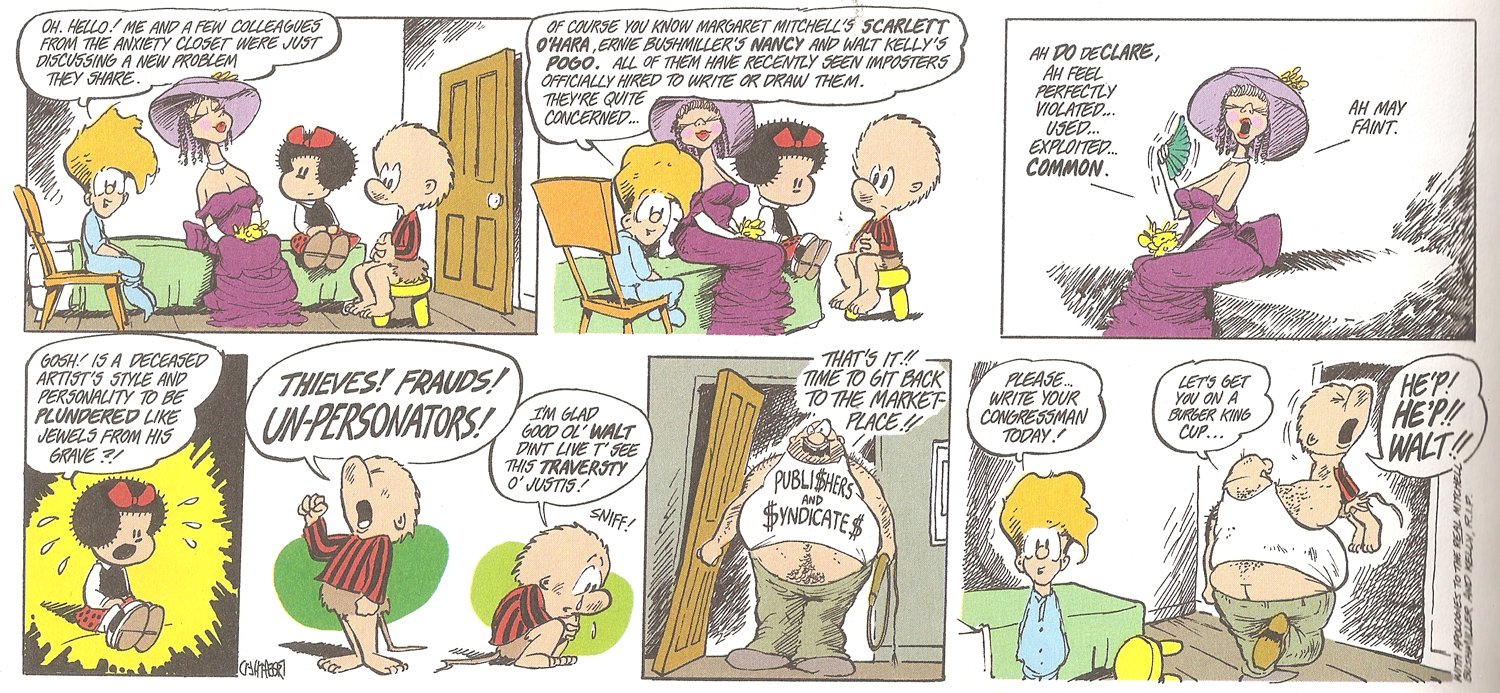 I was oblivious to all this. All I knew as a first-grader funnies fan was that there was this new strip with a bunch of weird animals in it. The books were long gone -- you wouldn't find any at Waldenbooks or B. Dalton. This controversial reboot was the ONLY REASON I knew what Pogo was.
