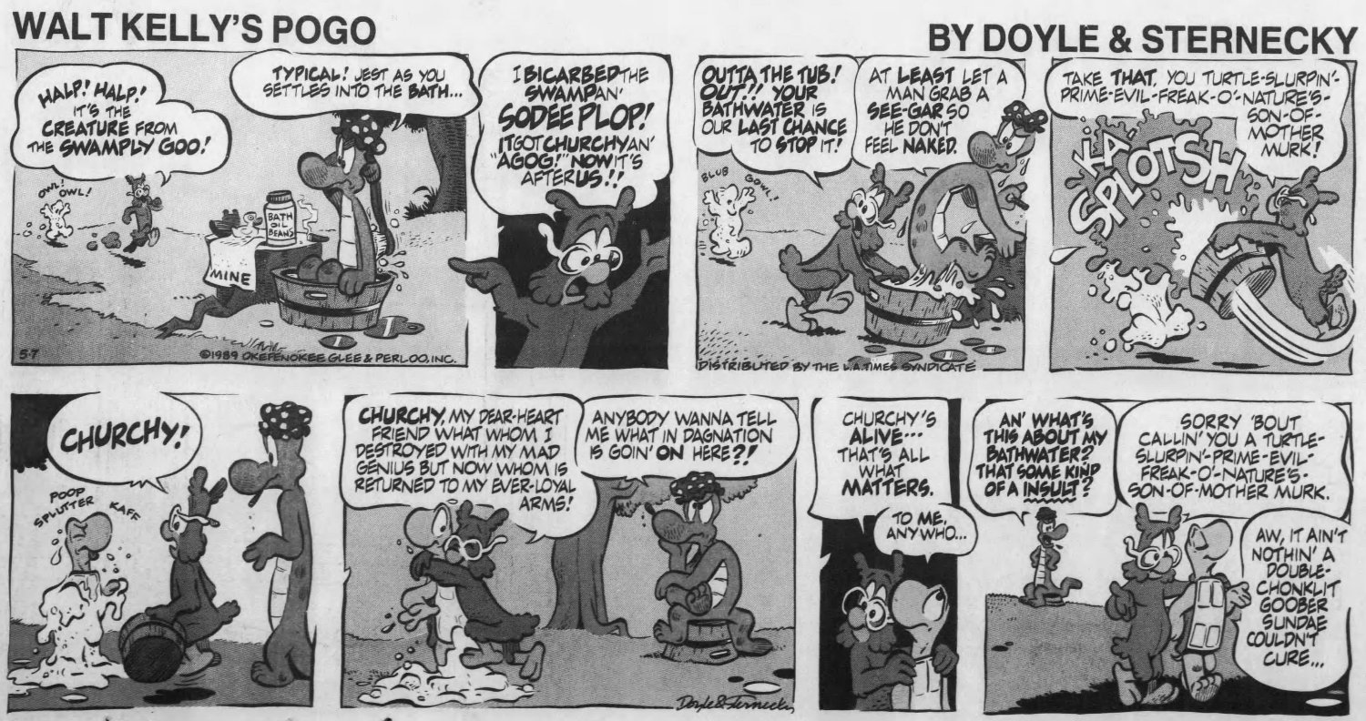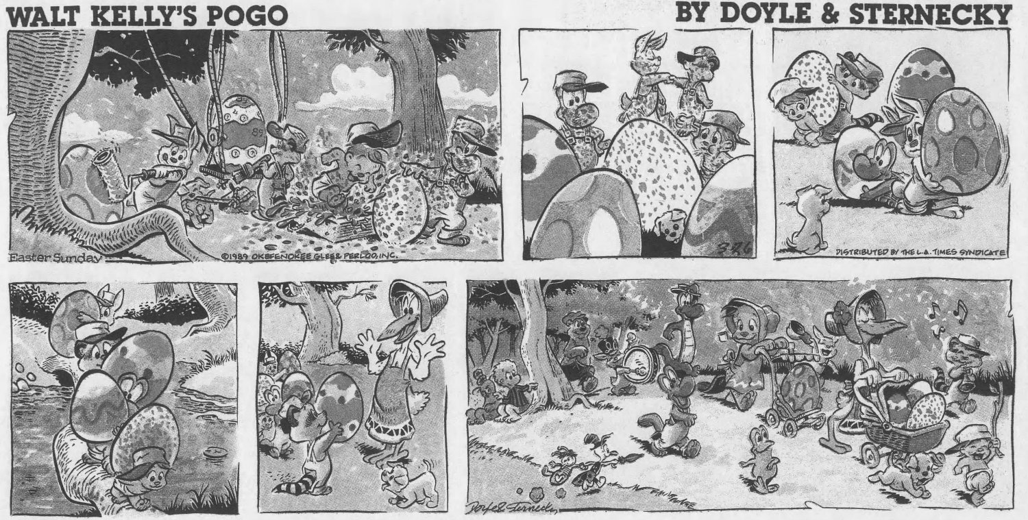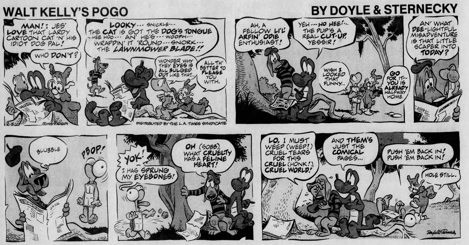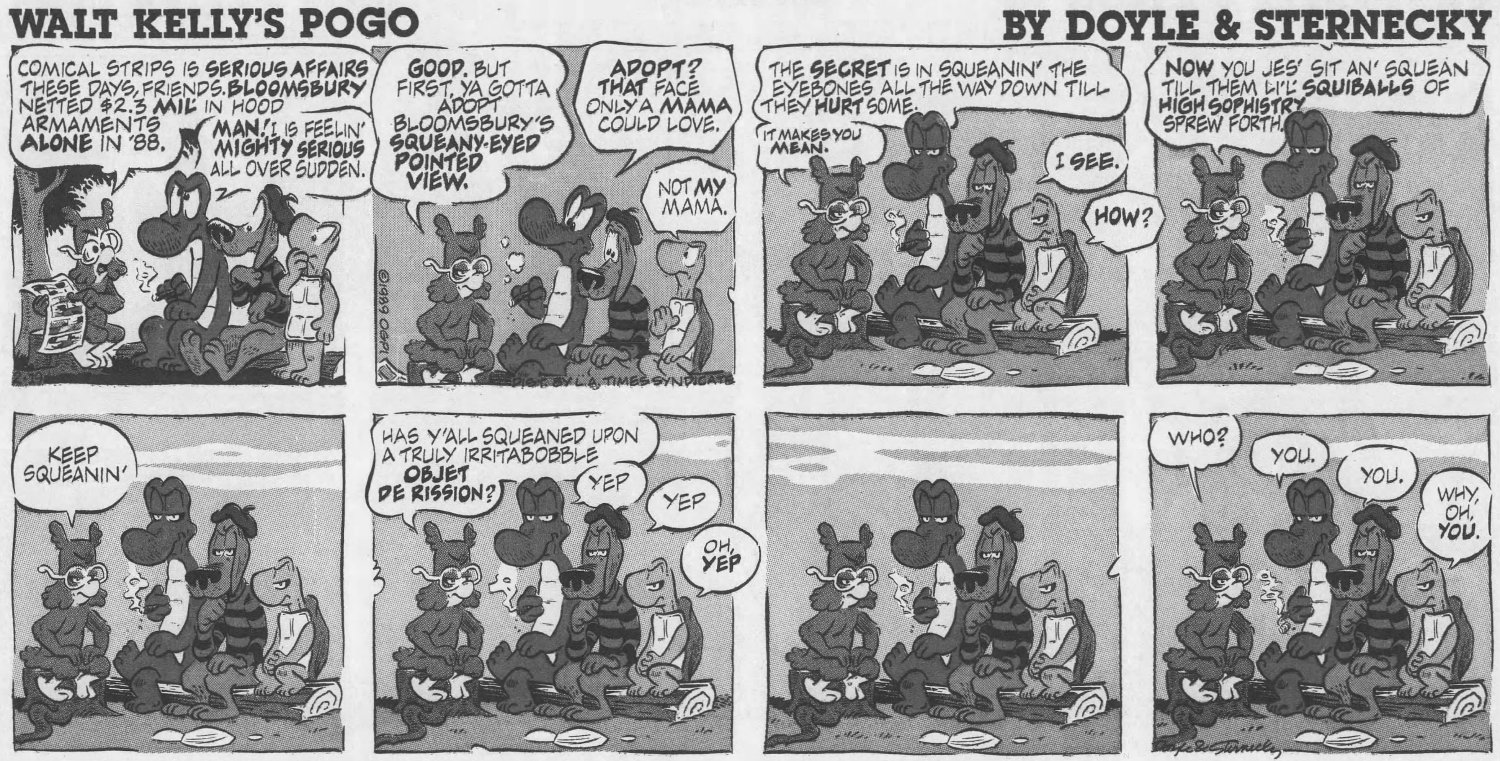 But it wasn't publi$hers and $yndicate$ who wanted Pogo back, it was Kelly's family, who noticed the media awareness of his creation had diminished significantly by the 1980s. The $yndicate$ were resistant to the idea, believing Pogo was too "wordy" for a modern audience -- basically too smart. They saw no value in it at all. Only the LA Times Syndicate was willing to take a chance on it, after the Kellys hired two men from Chicago -- Larry Doyle as script writer and Neal Sternecky as artist -- to bring the swamp back to life.