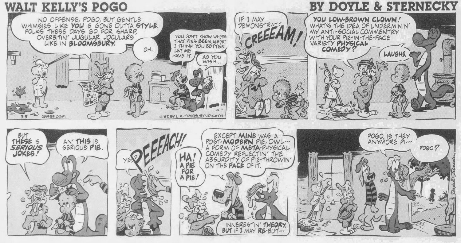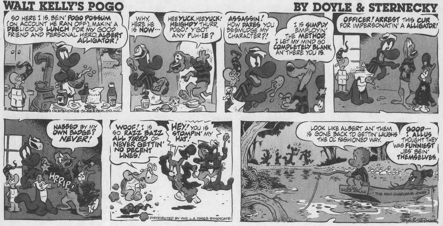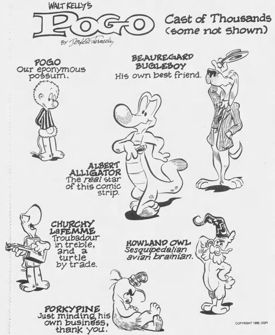 But it wasn't publi$hers and $yndicate$ who wanted Pogo back, it was Kelly's family, who noticed the media awareness of his creation had diminished significantly by the 1980s. The $yndicate$ were resistant to the idea, believing Pogo was too "wordy" for a modern audience -- basically too smart. They saw no value in it at all. Only the LA Times Syndicate was willing to take a chance on it, after the Kellys hired two men from Chicago -- Larry Doyle as script writer and Neal Sternecky as artist -- to bring the swamp back to life.