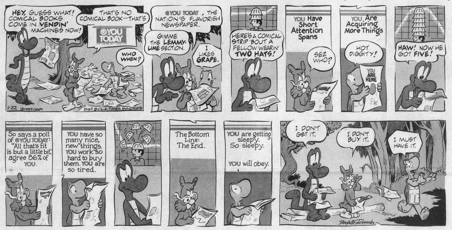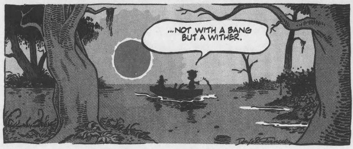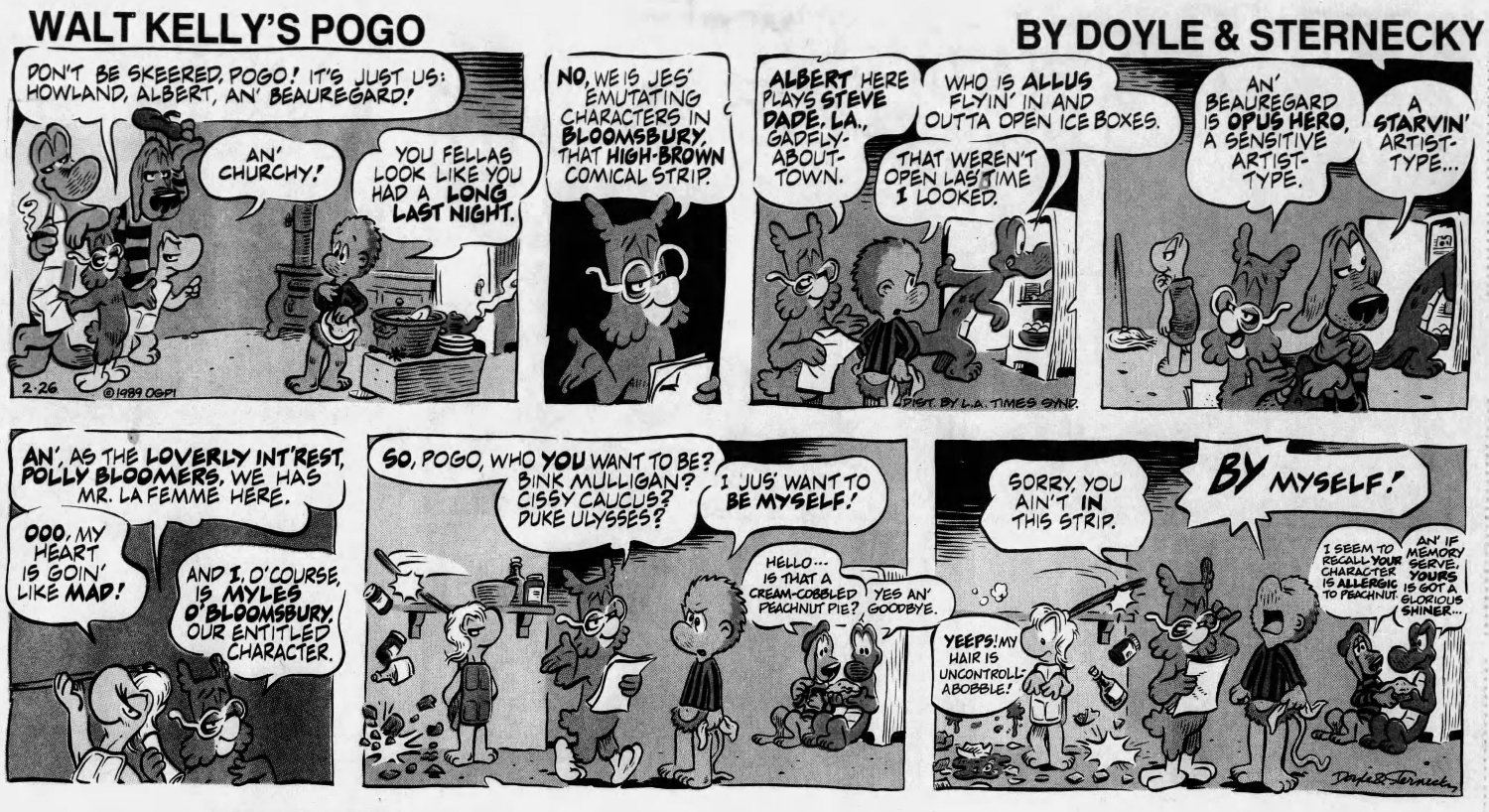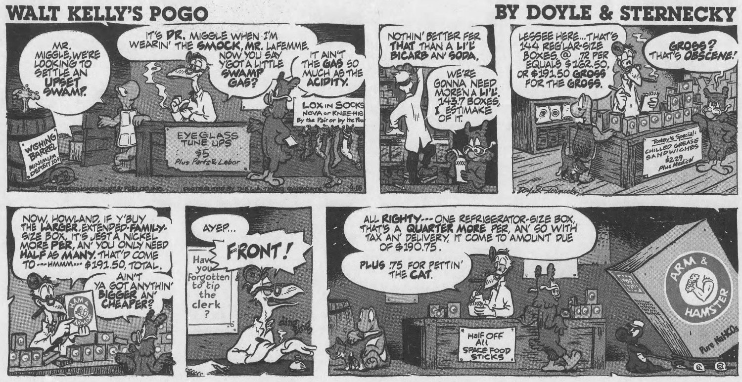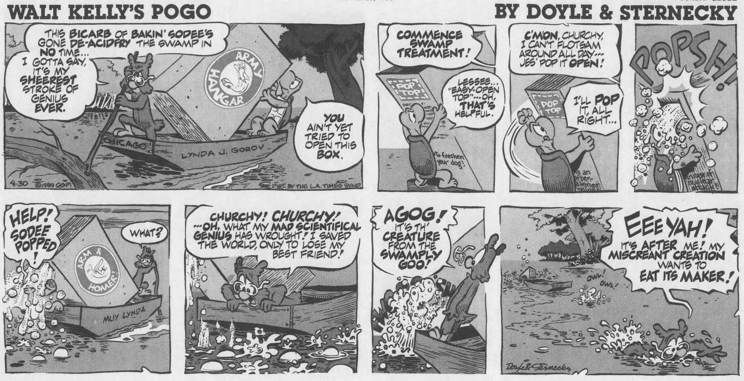 But it wasn't publi$hers and $yndicate$ who wanted Pogo back, it was Kelly's family, who noticed the media awareness of his creation had diminished significantly by the 1980s. The $yndicate$ were resistant to the idea, believing Pogo was too "wordy" for a modern audience -- basically too smart. They saw no value in it at all. Only the LA Times Syndicate was willing to take a chance on it, after the Kellys hired two men from Chicago -- Larry Doyle as script writer and Neal Sternecky as artist -- to bring the swamp back to life.