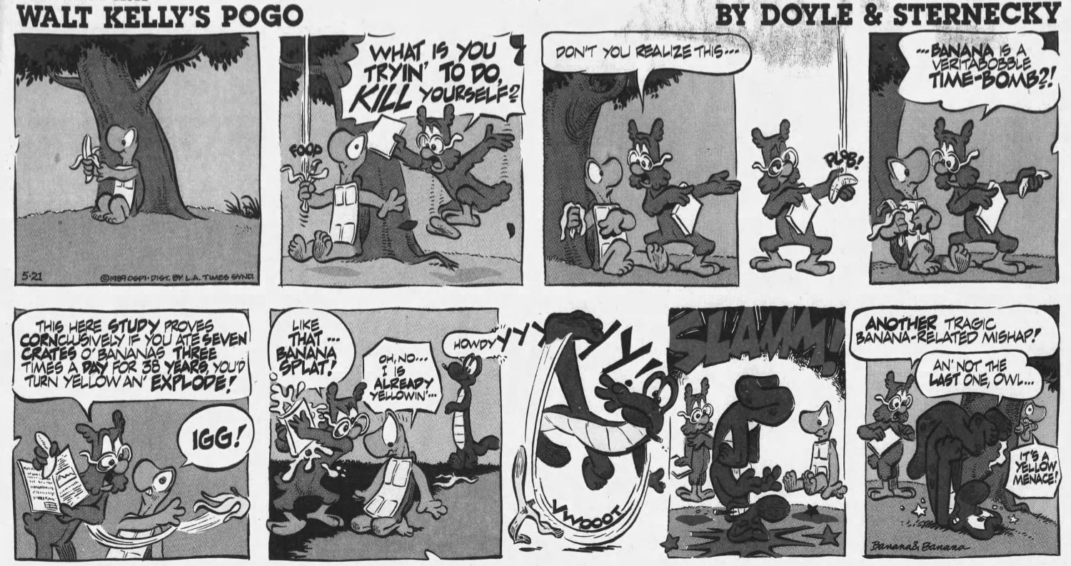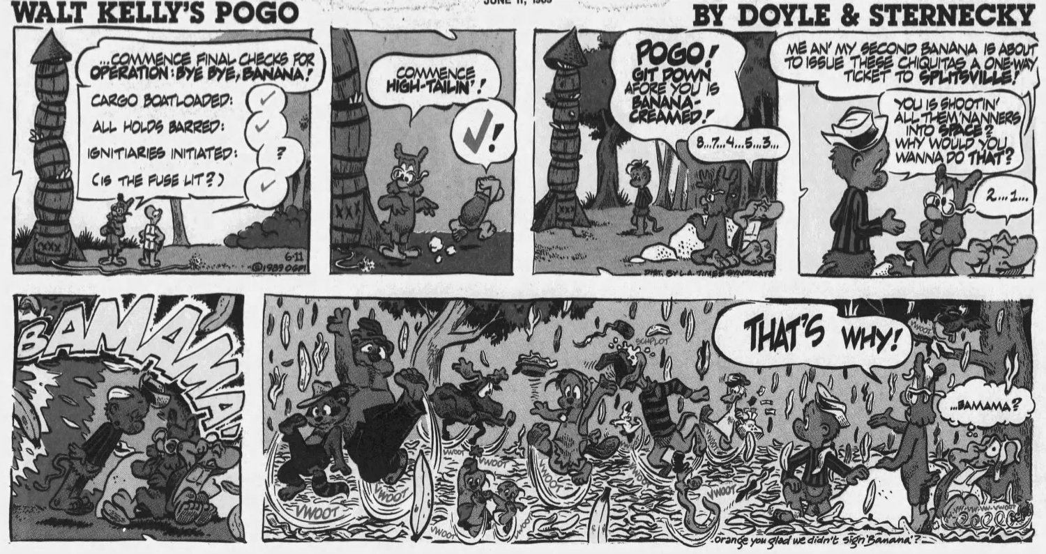 Somehow I recalled every bit of this bizarre "banana" arc below, especially how it ended. You don't easily forget a panel like "BAMAMA!!" I have no idea what it was trying to comment on. The War on Drugs maybe?