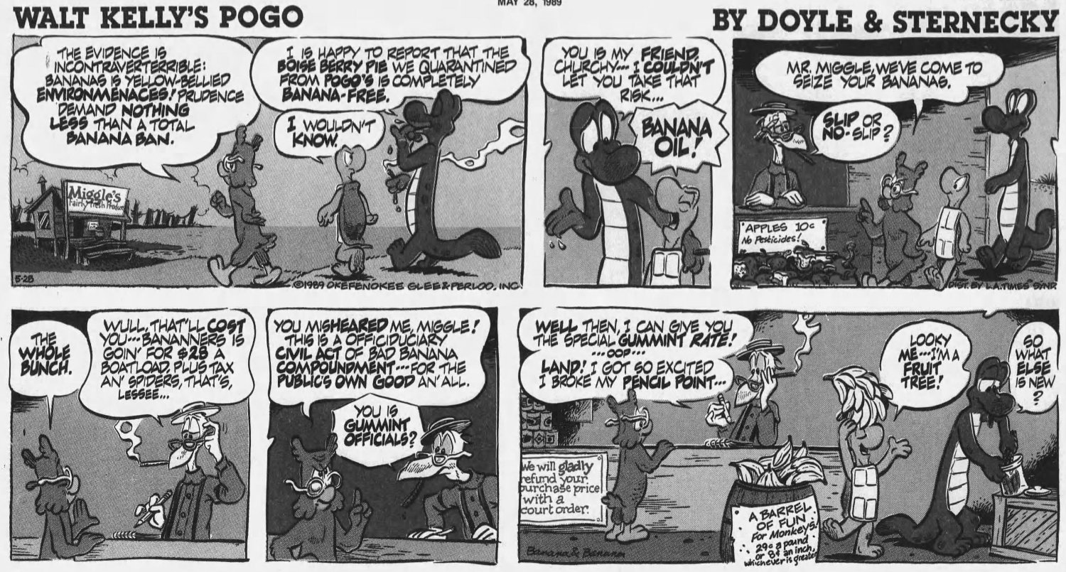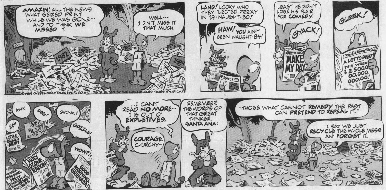 The original Pogo was, technically, a political strip -- everything that happened in the Okeefenokee Swamp paralelled something that was happening in real life. The new Pogo tries to carry on in that tradition, though the early 90s were far less eventful than the 50s and 60s, or even the 80s. Kelly had to tangle with the likes of Joseph McCarthy, but THIS strip only got two weeks to say anything about Reagan before it had to move on to the comparatively tamer George Bush Sr, who generated material about lips and broccoli and...that was about all you could do with him.