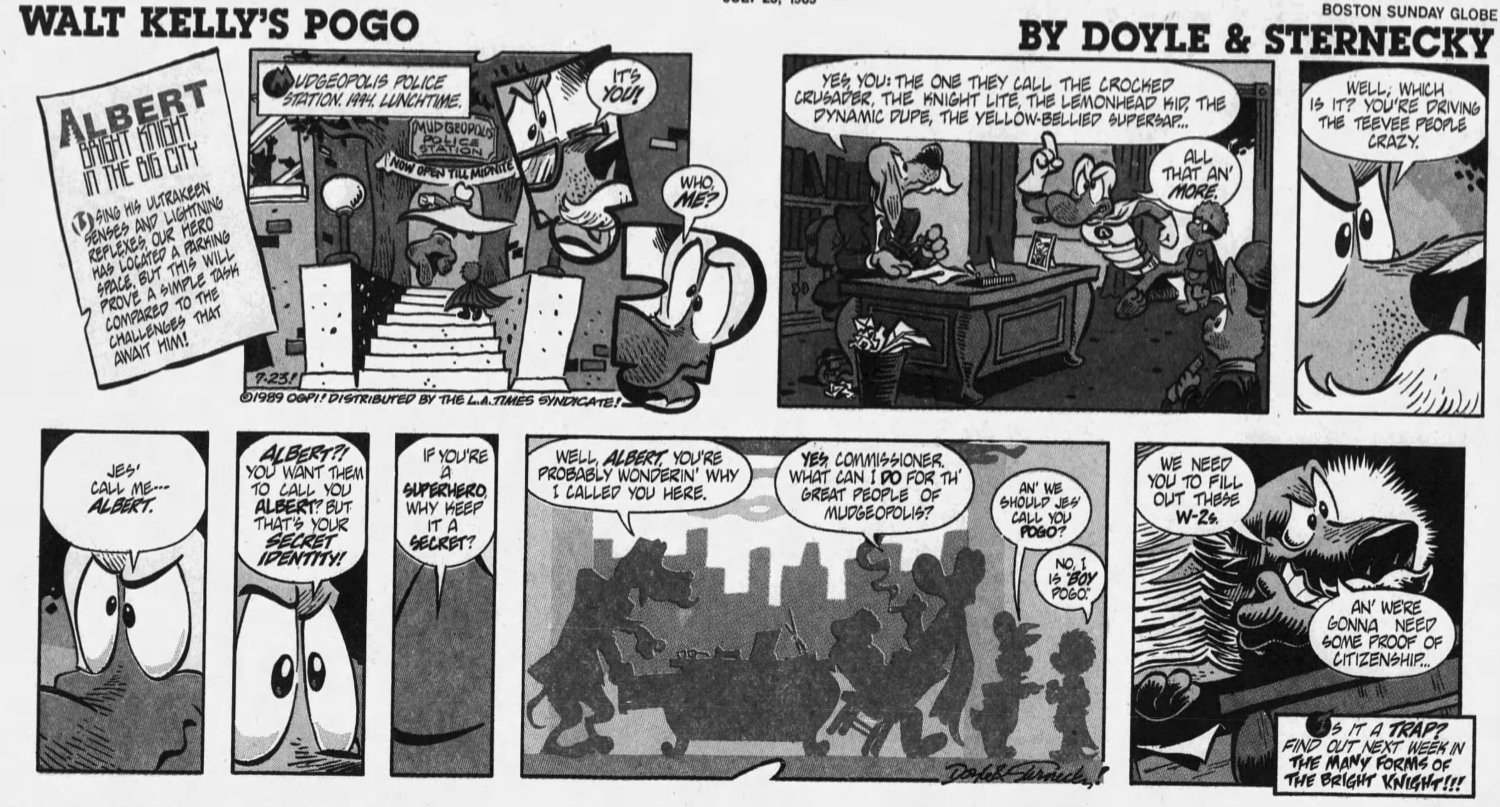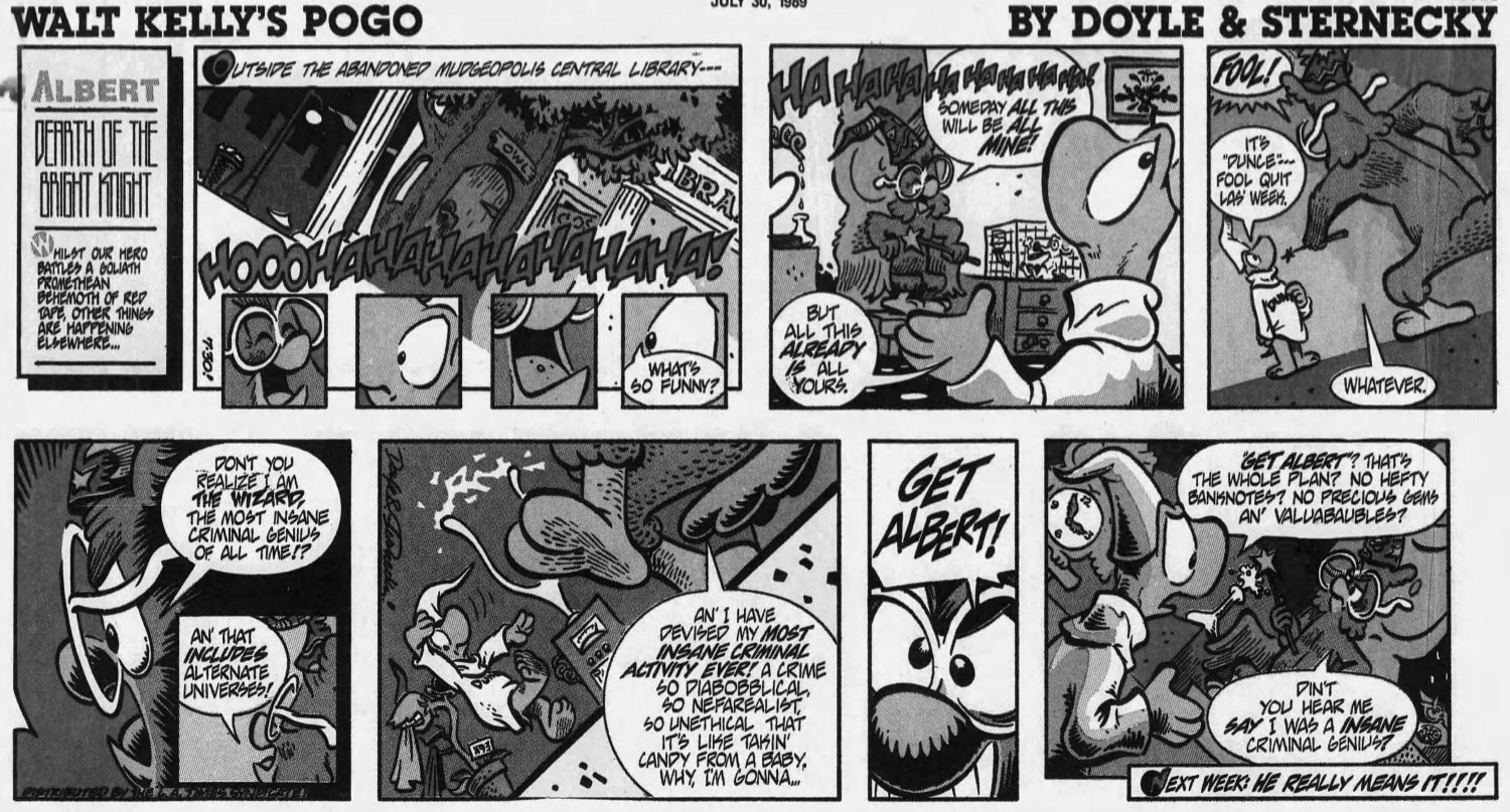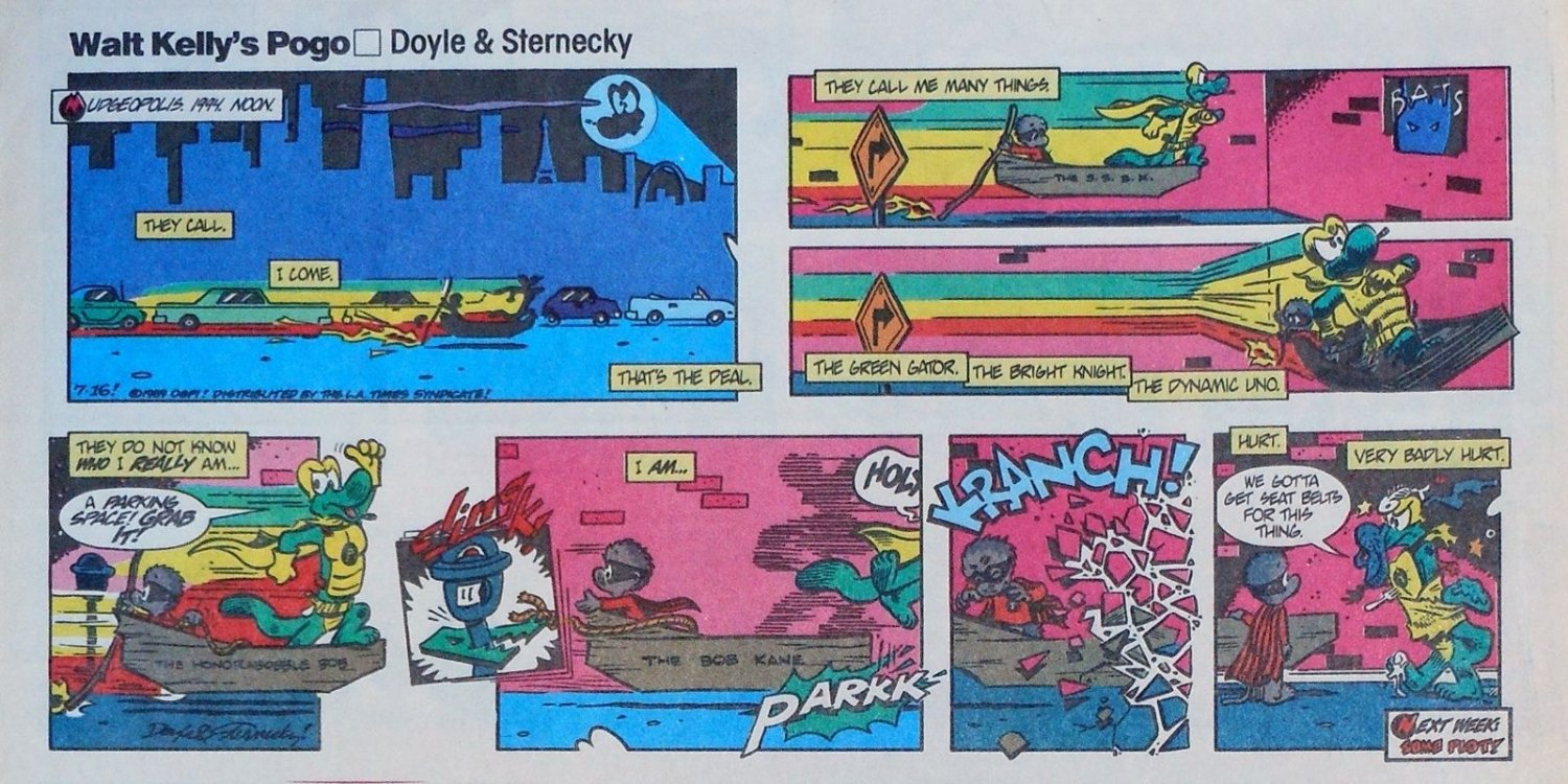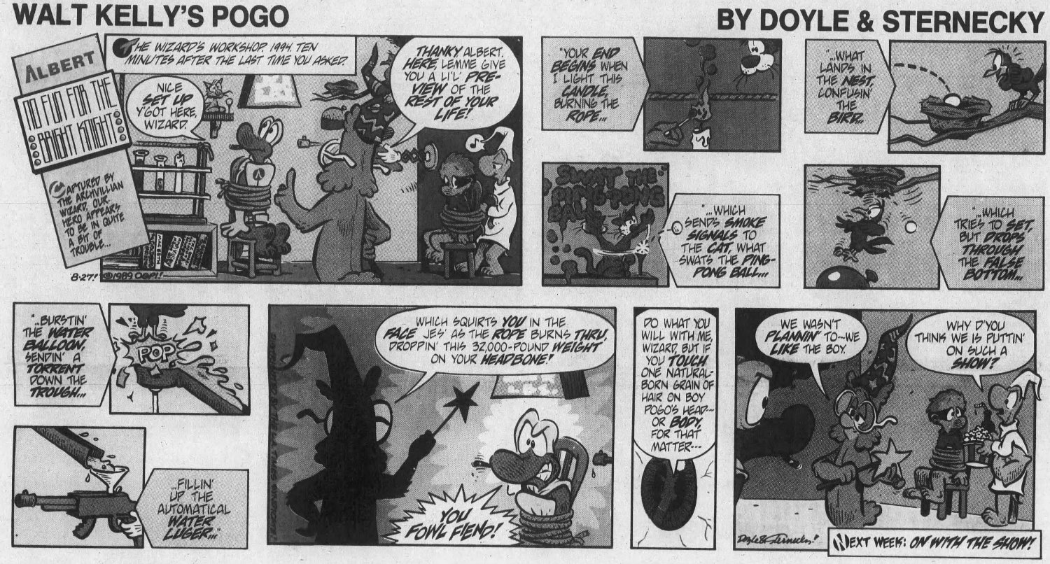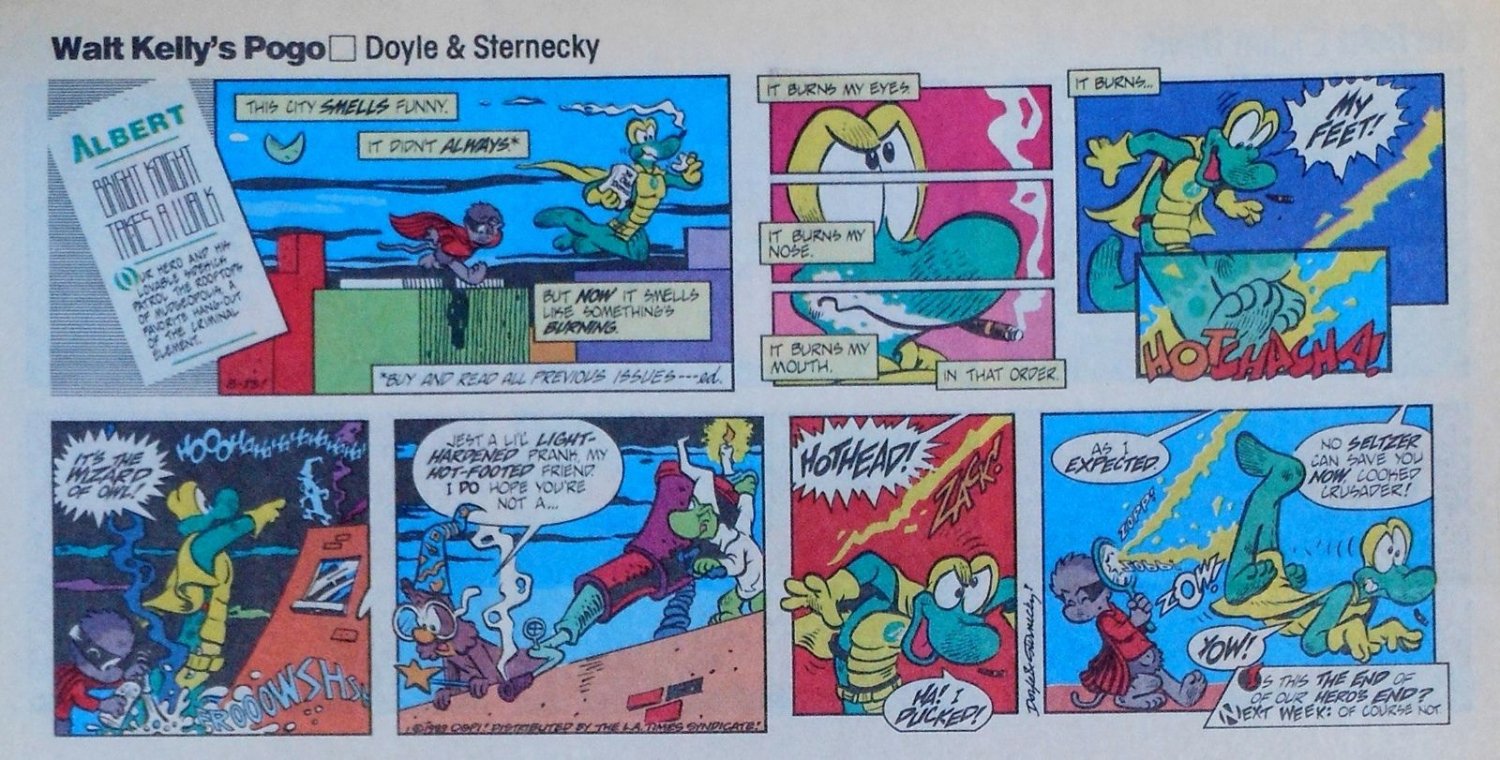 The reboot only lasted four years, sputtering out by 1993. It was never collected in any book to my knowledge, and I never got to read it beyond the point I was cut off, until scans of the entire run hit the torrent-sphere. Unfortunately they are mostly in black and white. When my dad finally got rid of his large basement stacks of newspapers, I lifted most of the funnies that had the color Pogo strips, but they're in storage now and I can't access them easily. If I ever get to it, I'll update this page with some nice color scans.