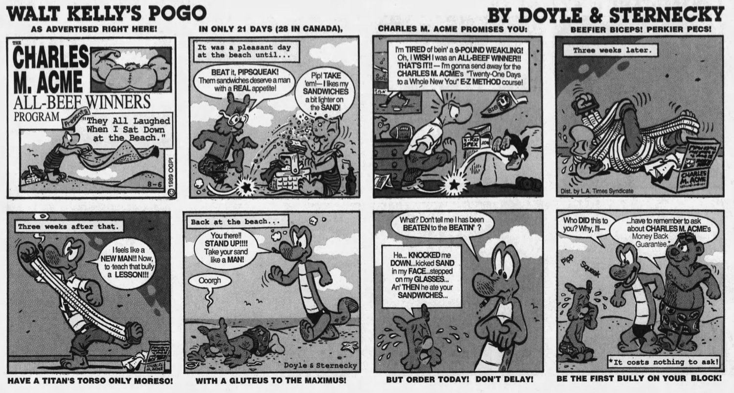 If we're spoofing comic books, then we have to make time for the "Charles Atlas Bodybuilding Course" parody. Thing is, with these chapters being separated by a week (and a totally different storyline on weekdays), doing this might have been confusing to some readers. It would've made more sense if they followed each other sequentially in the book collection that never happened.