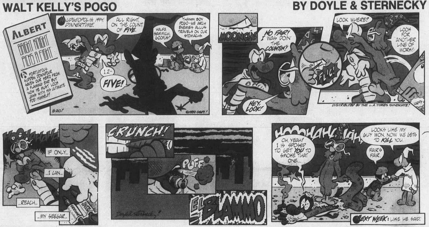 The Oregonian was one of the first to cancel Walt Kelly's Pogo, but far from the last. Subscriber numbers declined throughout 1990. In March of 1991, Larry Doyle quit the strip, leaving Sternecky to take over as writer AND artist. He continued solo for another year as papers continued to cancel, until splitting himself in March of 1992. And if you can believe it, two members of Kelly's family attempted to write and draw it themselves after that. This lackluster version of the strip paled in comparison to Walt, or even to Doyle and Sternecky. And by late 1993 nothing could be done to save it. After a spectacular introduction, that's how the ill-fated Pogo reboot ended....