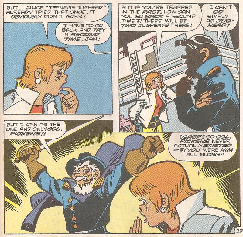 The old man is a clone, put in the freezer for emergencies once the real Jughead retired (in the future). If this wasn't off-putting enough, the Old Jughead Clone starts flirting with January (ick). Jan asks him how Jughead got out of the situation he's currently in, and he says HE went back as well to get him out...so he'll be doing that now. But not as Jughead...