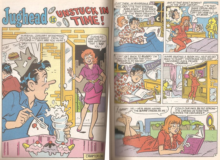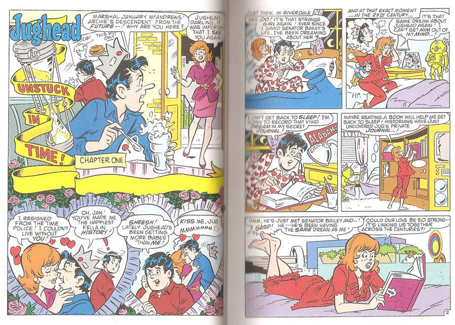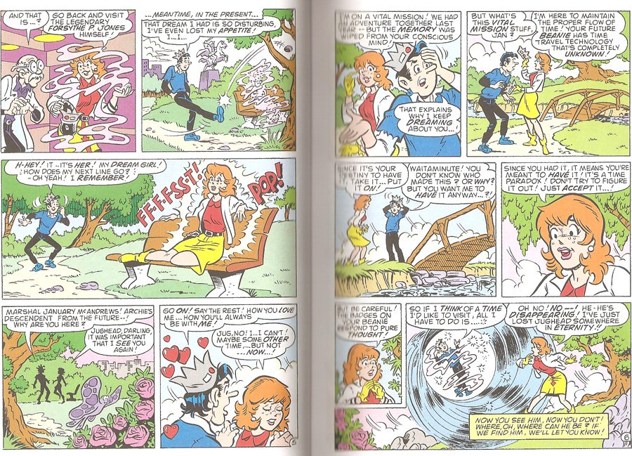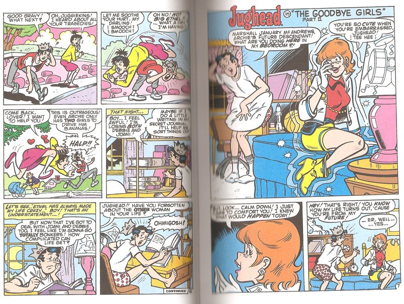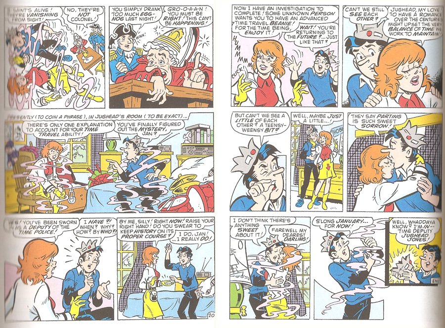 Instead Nate Butler, the man behind Archie's crazy "Hot Dog" series from the same period, would write "The Good-Bye Girls," a story that mainly existed to write off Jughead's 1980s girlfriend Joani Jummp and restore his classic status as a girl-hater. Jughead's Time Police would be the exception to this. January materializes into Jug's bedroom on Page 7 to speak cryptically about his future and then teleport away. The appearance is an odd one.