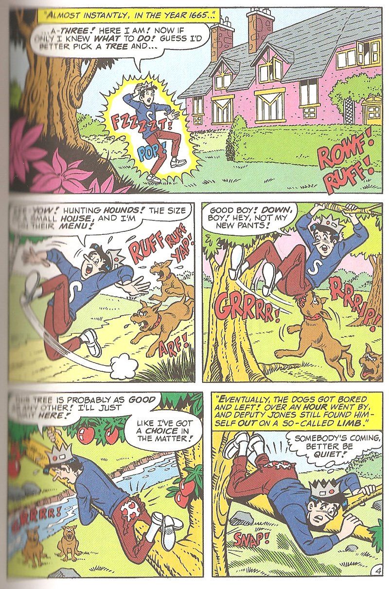 A mere WEEK after "Unstuck In Time" hit shelves, a Time Police short story appeared in the regular Jughead comic: "How Jughead Lost His Pants Saving The World." January narrates the tale of Jughead traveling to 17th century England and getting chased by a dog. He climbs a tree to escape, but the dog manages to bite a giant hole in his pants. He's stuck in the tree until everyone leaves the area, and he's hungry. Good thing it's an apple tree....but Jug drops the apple he just picked and it lands on the head of the guy who was sitting under the tree. Fortunately the man was Isaac Newton, and Jughead saved history by inspiring him to write his theory of gravity. To commemorate the event, his ripped pants were preserved in the Jughead Museum.