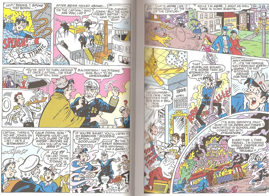 January appears in the park and Jughead recognizes her as his dream girl, and rushes over to her. She informs Jug of their past adventure and explains why his memory was wiped. Then January gives Jug the beanie and tells him "Since you had it, it means that you are fated to have it." One would assume it would be dangerous to give Jughead a thought-activated time travel device without even telling him how to use it, and...it indeed is. The next few pages depict Jughead chaotically surfing through time. Jug is shot at by the Red Baron in World War I, falls into the ocean and is rescued by the captain of...the Titanic, teleports into the 1906 San Francisco earthquake, and spends a few seconds as a Roman gladiator. There are an unusually large and varied number of scene changes here, drawn amazingly by artist Doug Crane (who had a background in animation).