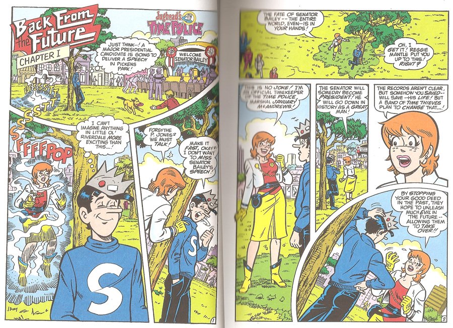 In the summer of 1988 Margopolous wrote a Giant Series issue starring Jughead called "Back From The Future." While the title suggested a Back to the Future parody, the story itself does not resemble the movie at all, going off in its own crazy direction from the very first panel. Jughead is lounging at Riverdale's Pickens Park, waiting for current presidential candidate Senator Bailey to make a speech. Suddenly, from out of nowhere, a redheaded woman in futuristic clothing materializes behind him in a plume of smoke. She introduces herself as January McAndrews, Marshal of the Time Police, and tells Jughead that for the next few hours, he is crucial to the flow of history.
