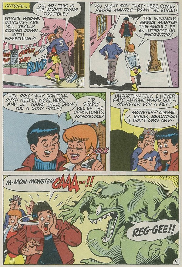 This issue is also notable for being the only time January meets the regular Archie gang. Betty says hi, Archie says Jan looks "somewhat familiar" (she's his descendant) and Reggie tries to hit on her. For his trouble, he gets a giant holographic monster appearing behind his back while January laughs. You would think this would all be memorable, but the peanut butter scene kind of drowns anything else out.