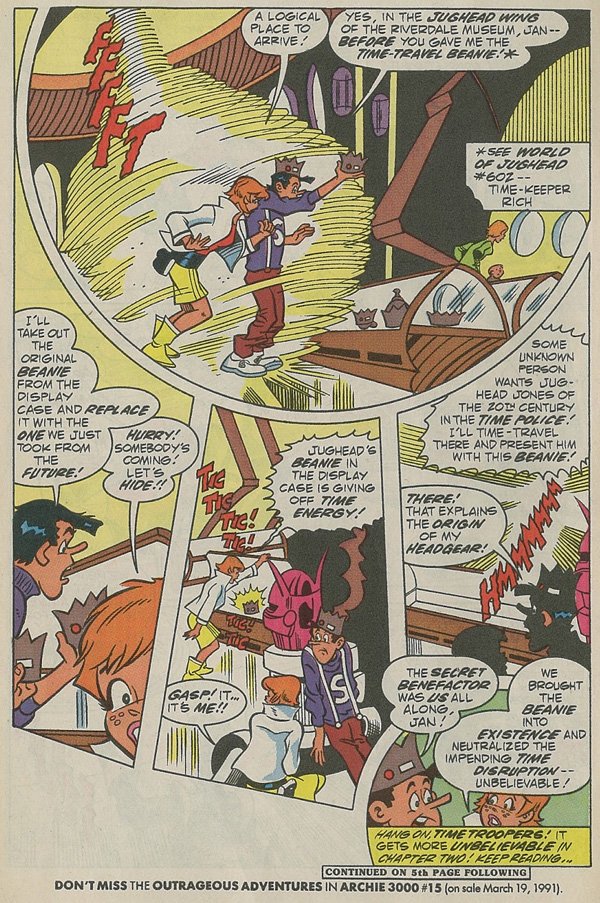 Even before Jughead's Time Police was a proper series, the big mystery was "Who created Jughead's time beanie?" Margopolous was pretty certain this would be the last Time Police story he would ever be paid to write, and he was correct, so he wrapped up that mystery as quickly as possible. Turns out Jug and Jan created the beanie themselves...by traveling to the far future, having it made for them, then traveling back and putting it in the Jughead Museum for January to find. Kinda weak, but the best he could do, having been cut off so early.