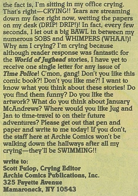 Very few of the new books Archie put out in the early 90s would last past six issues (or one year on a bimonthly schedule). There's no way to truly know how badly Jughead's Time Police sold, but they published a note from the editor in issue #3, and it went like this: