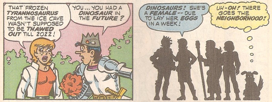 Apparently Jughead's prop shield is strong enough to deflect one of Le Fay's attacks back at her even though we just saw it reduce a boulder to pebbles. Le Fay retreats and disappears for now. Jughead asks Jan what they're supposed to do without their timepieces. Jan tells him they should go see Merlin, who was actually the founder of the Time Police and traveled back to this time when he retired. And as this issue reveals, the entire Arthurian legend was actually people from the future with magic-like technology and the peasants couldn't tell the difference. Also, dinosaurs are coming back VERY soon: