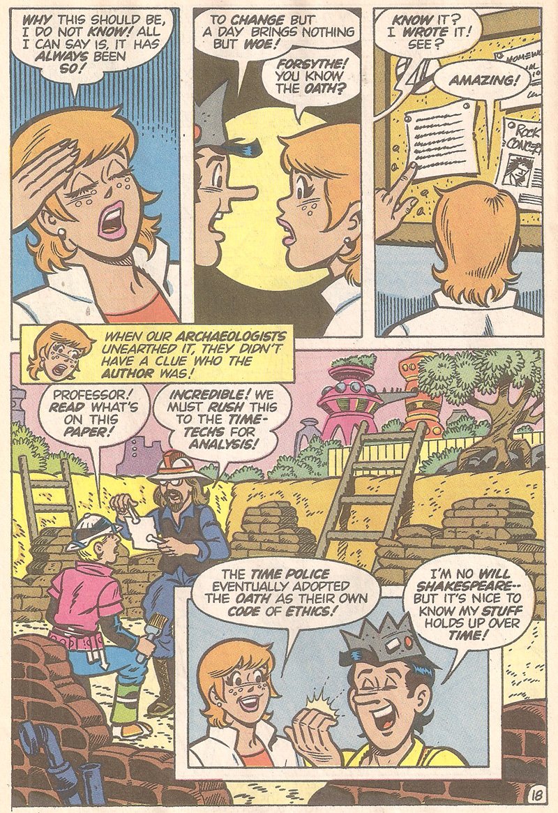 Now get this: at the end of the issue, when January decides it's time for Jug to learn the Time Police's official motto, she starts reciting the same poem. It turns out in her century they excavated Jug's paper from the ruins of his house (without knowledge it was his house) and thought the poem was so good that they adopted it as the Time Police code of ethics. This culture worships Jughead to the point that they'll fawn over anything he's written without even knowing he wrote it. I should pause here and point out this is not the kind of series in which you should stop and think about logic, or you'll be driven insane. This is true for most time travel stories but it's especially true here.