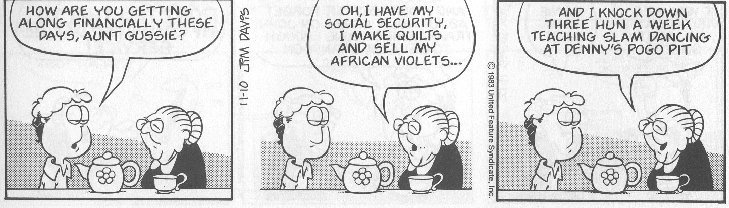 I get what Davis was trying to do with this one, but....it tries too hard and falls flat. The sudden change in speech is too abrupt and different, and it flies against the other five Aunt Gussie strips that ran before this one. In addition, I'm not sure what Denny's Pogo Pit is. My first thought was that it's a bar, but then again, they don't give dancing lessons at a bar. What is Denny's Pogo Pit for and why is it called that? Do people go there to read Pogo strips? Do they come to bounce on Pogo sticks? What?