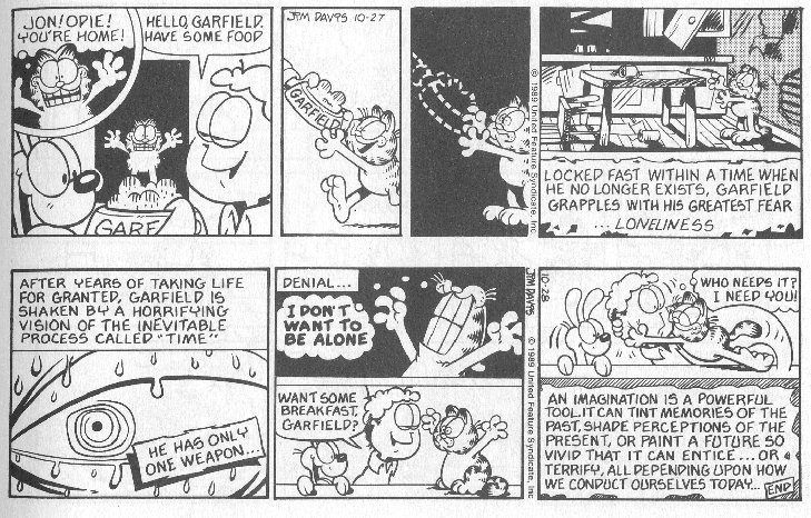 I first saw this sequence in the papers and I thought it was great. Many, many years later, when it became hip to read Garfield with a cynical attitude toward it, this story gained sudden popularity, because it suggested that in 1989 Garfield fell through a wormhole in his sleep and wound up in the future, where he remains to this day.