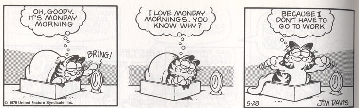 Actually it makes a LOT more sense in the book collection: the Tuesday strip shows Garfield waking up and thinking "You know it's Monday when you wake up and it's Tuesday." It was a two-parter, but nothing in Strip 1 indicated that. What a baffling thing that must have been to wake up to.
