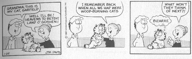 Bizarre indeed, especially since this is something no old woman has ever actually said. What does Davis know that I don't? Or what does he think he knows that he got wrong? He reused this "wood-burning cats" line for the Garfield Christmas special, and reused it again in a later book's gag page by showing a "Wood-burning Dog." He thought it was a riot, but I don't get it.