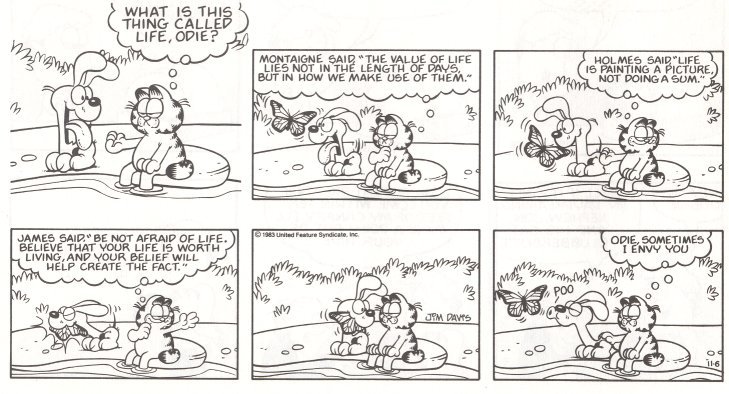 For a strip that most people consider anti-intellectual fluff, Garfield pondered the meaning of life a lot in the early years. I think he nailed it when he said, "Life is like a Porsche. It goes too fast, but that's okay, because you can't afford it anyway."