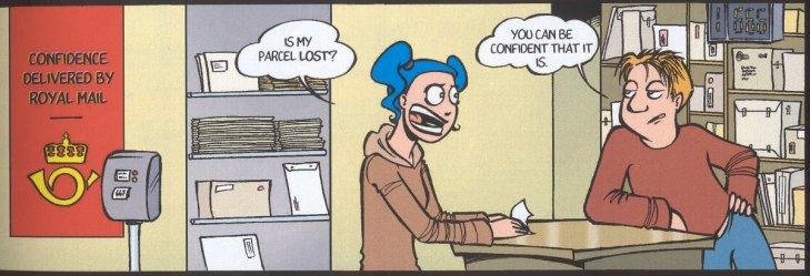 The original strip made fun of the slogan of the Norwegian postal system. Here it's been changed to Royal Mail, the postal service of the English, but the conversation isn't as good because the joke worked better with the Norwegian slogan. (I don't remember what it is -- the site I first got translated Nemis from is now offline.)