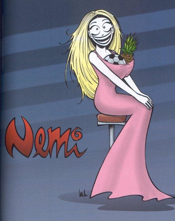 Nemi has over a thousand faces, and they're all great. She can look traffic-stoppingly beautiful in one panel and absolutely horrifying in the next -- that's how variable and versatile her face is. It's the best face in cartoonist history. Nemi is awesome. How awesome is Nemi?