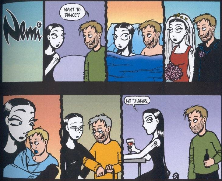 Sometimes Nemi will get on a high horse and ride it for all it's worth, but thankfully, not always, and not always with a position that's hateful. The lesson in this strip is extremely wordy, but hard to disagree with.
