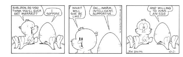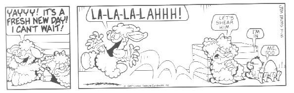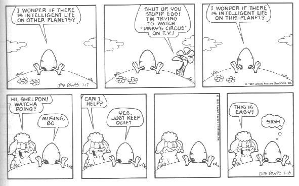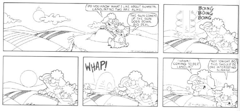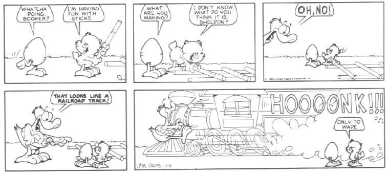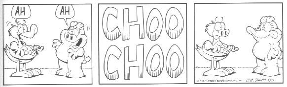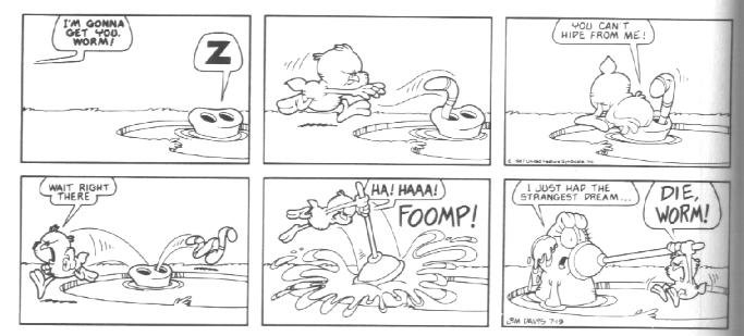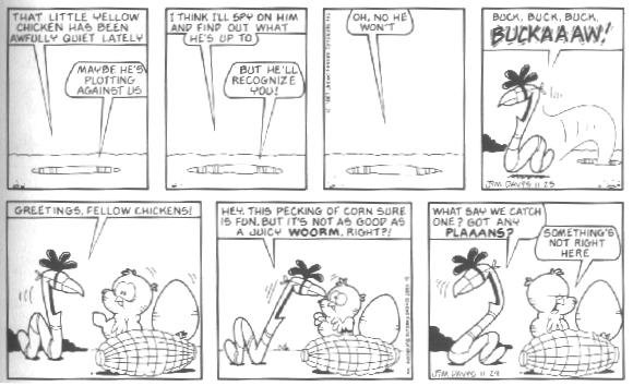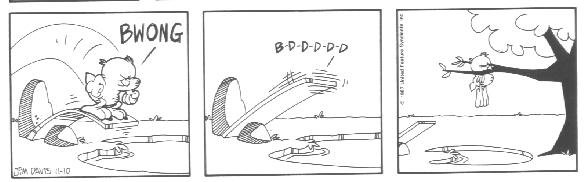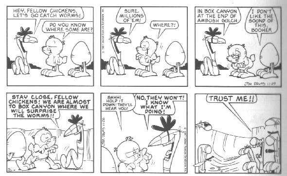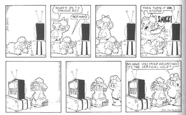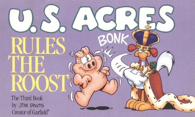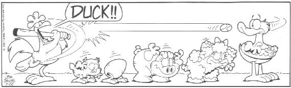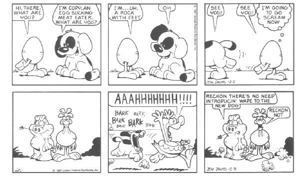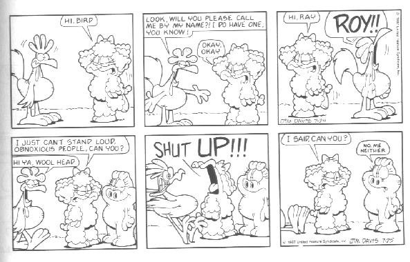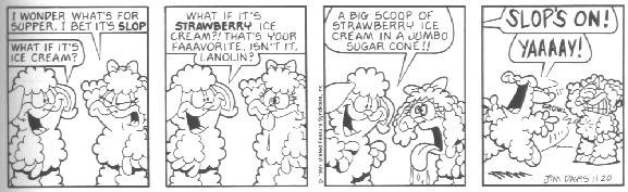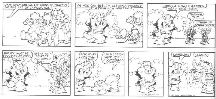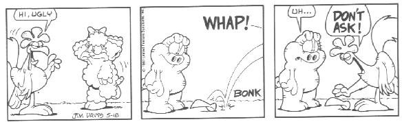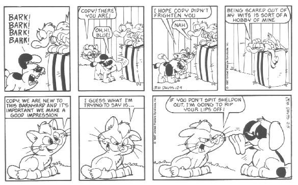 The last week of strips in the book introduces the Lost Members of U.S. Acres--Cody and Blue. Cody was a stupid mutt (though not nearly as stupid as Bo) whose main interests were casually terrorizing other members of the farm by trying to gnaw them to bits.....Cody had no reason to do it; he just did this because that's what he DOES. Blue was a blue cat who followed Cody around to keep him out of trouble.