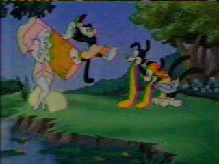Can you spot the mistake in this picture? That's right....Wakko's left ear is for some reason going out the front of his hat. This happens in a few scenes in "The Big Candy Store," and some fan once speculated that it must have been the result of an early model sheet. I don't think so--otherwise that error would have been in every shot.