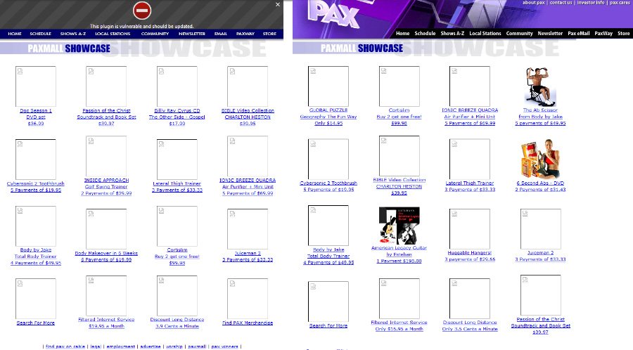 Let's look up paxmall.com on archive.org. A March 29, 2004 archive doesn't show much available, and a followup from March 2, 2005 doesn't look any different. PAX Mall looks nothing like it does in the ad -- instead of its own site, it's simply part of the PAX website as a whole, and it is just one page in size, full of random products. Most of the things you can buy are weight pills and exercise machines. Either the average PAX viewer really cared about building up their abs, or these are all just the products advertised during PAX's broadcast, ready for purchase.