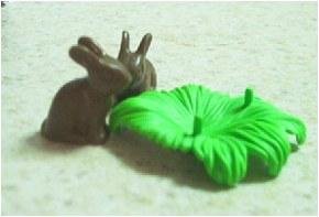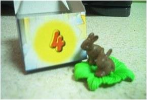 Wait, are these hares? They might be hares. They've got longer legs than storebought rabbits, and no pretty color patterns. Plain old brown. Hey, wait a second - maybe they're chocolate Easter bunnies? Oh wait, it's a Christmas advent calendar. While two rabbits and a sheet of lettuce isn't exactly the number one item topping wish lists this year, at least it's not another stupid lamb. Could be worse too - they could've given us a plastic rock, or some plastic sticks. Sticks are for kids. :/
