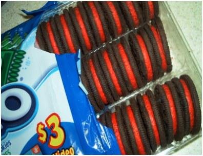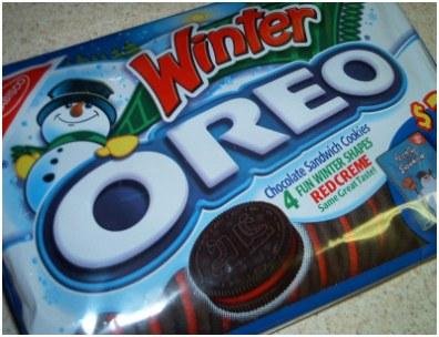 Winter Oreos have arrived! With red creme filling -- very very red creme filling! You might remember Nabisco's Halloween Oreo Cookies from this past October; the "winter" variety essentially uses the same formula. Change the creme color, add a few seasonal scenes to the cookie tops, and keep the taste the same. It's the kind of top secret campaign companies pay billions for. And you can eat it for Christmas.
