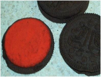 Strangely enough, the red creme seems to accumulate 100 times more cookie dust than any of the previous creme colors -- and don't tell me it's just more noticeable with red either, because cookie dust is never more seen than when drizzled over the albino glory of the original Oreo's original middle. There's just something weird about this red filling. I wonder if it's from another planet???????