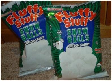 I've been holding on to these for weeks, gleefully awaiting the day I'd be able to unseal those bags and throw around faux snowballs. As you can see, they missed the target by a few inches. They're only "snowballs" in the sense that they're clumps of white stuff. They're neither shaped or sized like the real deal, so we're lucky cotton candy is so easy to mold. Indeed, with a quick few rolls in your filthy palms, Fluffy Stuff's holiday venture becomes the most perfectly room temperature bunch of snowballs you could ever hope to nail someone in the face with.