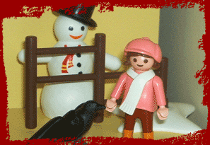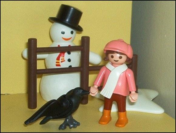 Mare is the lucky recipient of a pink hat and a white scarf -- now she can style the Hell out of Christmastime and stay warm all the same. Now that the frozen skin around her neck and earlobes no longer pose a constant distraction, Mare's free to complete her mission. What's her mission? That's what I wanna know. I don't like the looks of things, to be honest. Mista Snowman seems fine with it, but what's up with him being outcast to the far side of the snowy fence? Mare is chatting up a storm with Bird...where's the love for Mista Snowman?